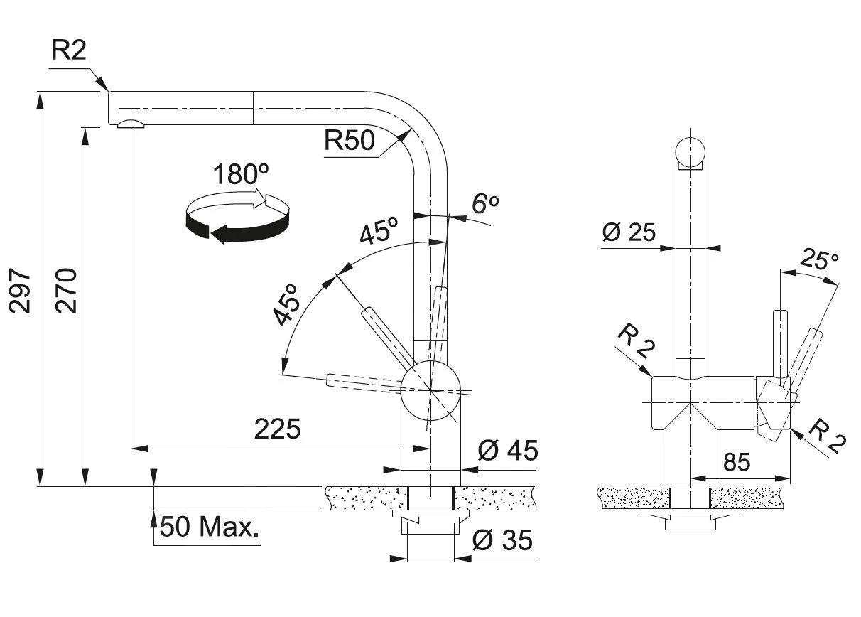 - hauteur de la robinetterie : 297 mm