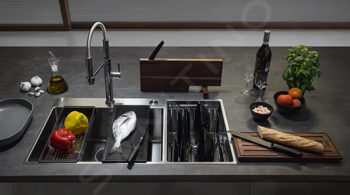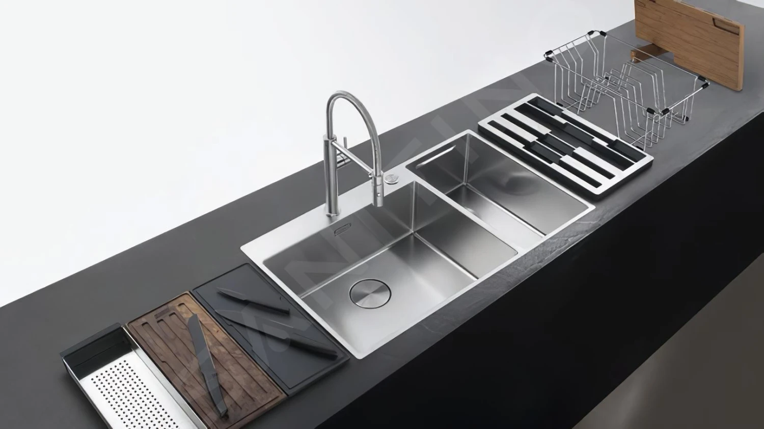 - le prix comprend les éléments suivants : cuvette, planche à découper en bois, planche à découper en plastique, 3 couteaux avec support en bois, égouttoir à vaisselle, couvercle, bonde à panier Easy Click 3 1/2’’ avec trop-plein et cache inox de la bonde, siphon gain de place 6/4’’ avec prise pour lave-vaisselle, 2 trous de 35 mm de diamètre pour le mitigeur et le bouton Easy click à aspect inox.